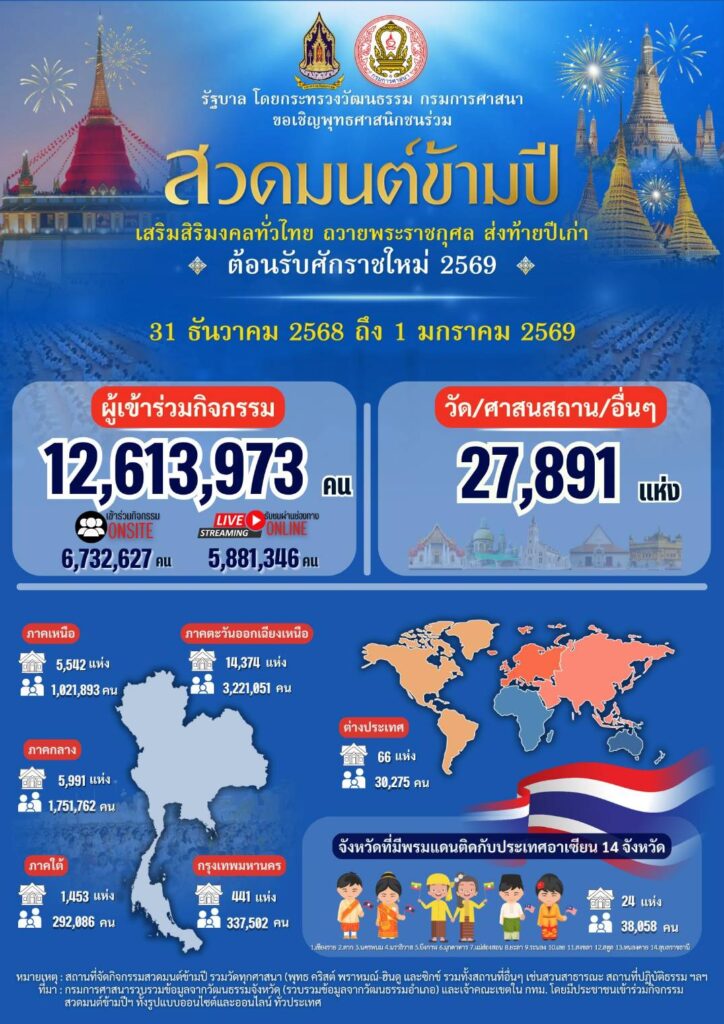เผย ตัวเลขคนไทย–อาเซียน–ทั่วโลก ร่วมสวดมนต์ข้ามปี กว่า 12.6 ล้านคน ถวายพระราชกุศล เสริมสิริมงคล ต้อนรับศักราชใหม่